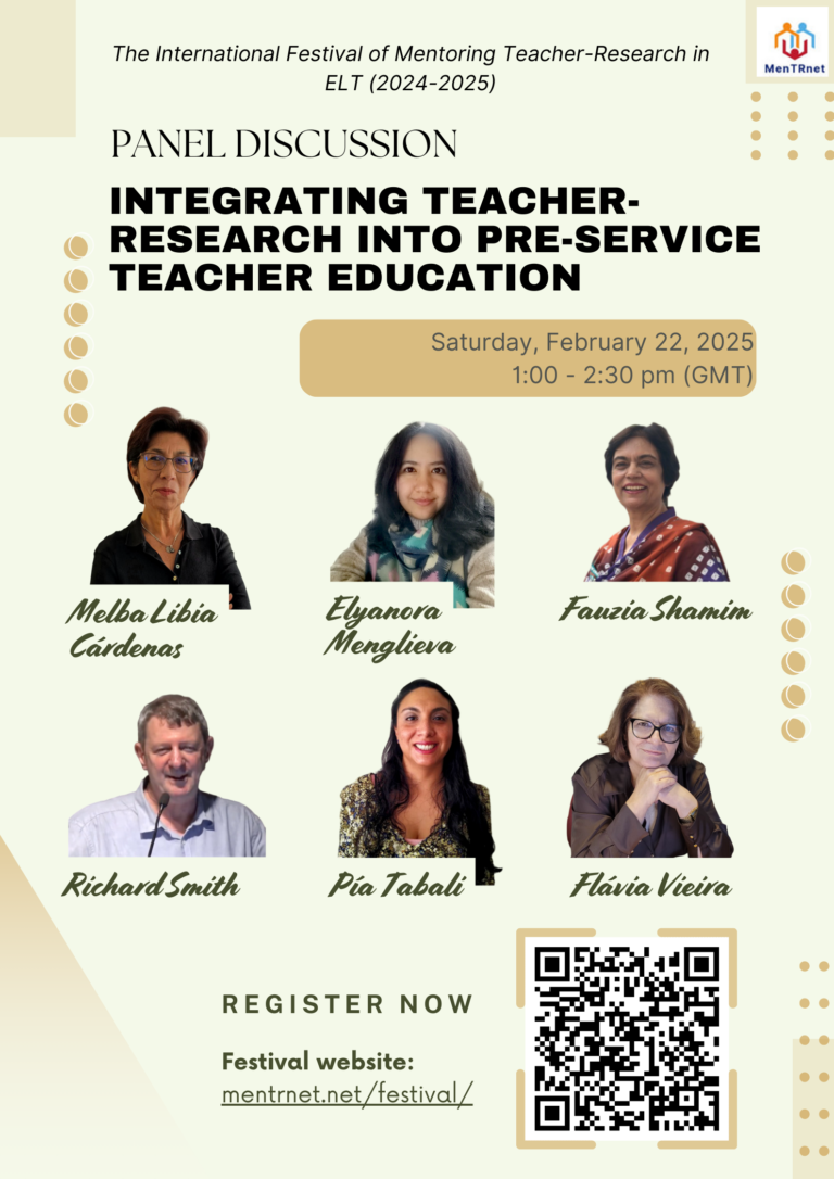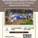Saturday, 15 March 2025: a webinar in the International Festival of Mentoring Teacher-Research showcasing teacher-research mentoring for large groups in India and Cameroon, chaired by Richard Smith and featuring Ravinarayan Chakrakodi, Eric Ekembe, and Vinayadhar Raju Prathikantam.